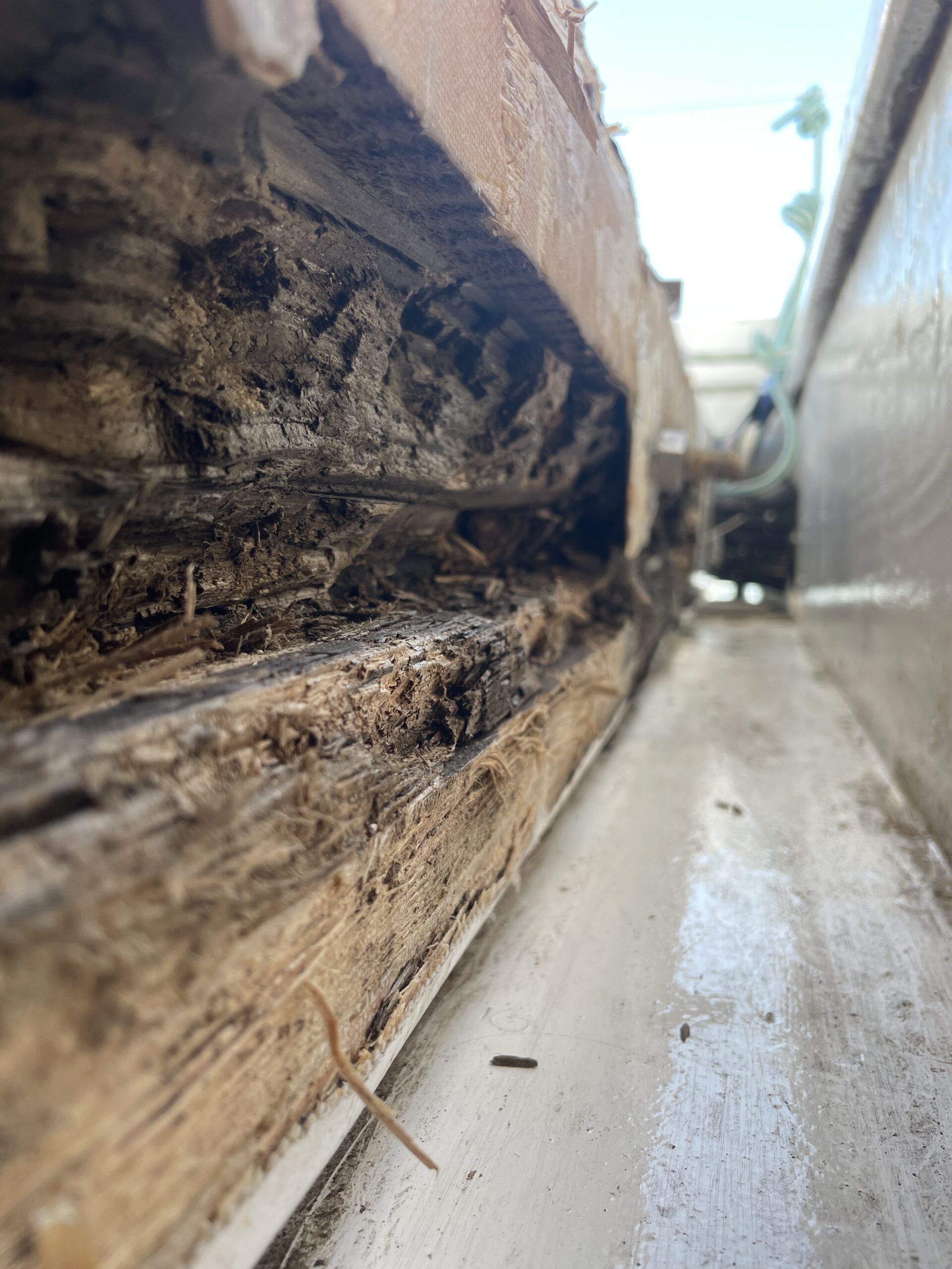 The ship has been making strange noises for the last few days. Mostly in the rear of the starboard hull. The noises have escalated to a very unpleasant noise. On the night of the 30. 6 – 1.7 we uncovered one of the beam that connects the hulls of the catamaran together. We found a large crack in the beam and the vast majority of the beam was completely soaked and rotten.